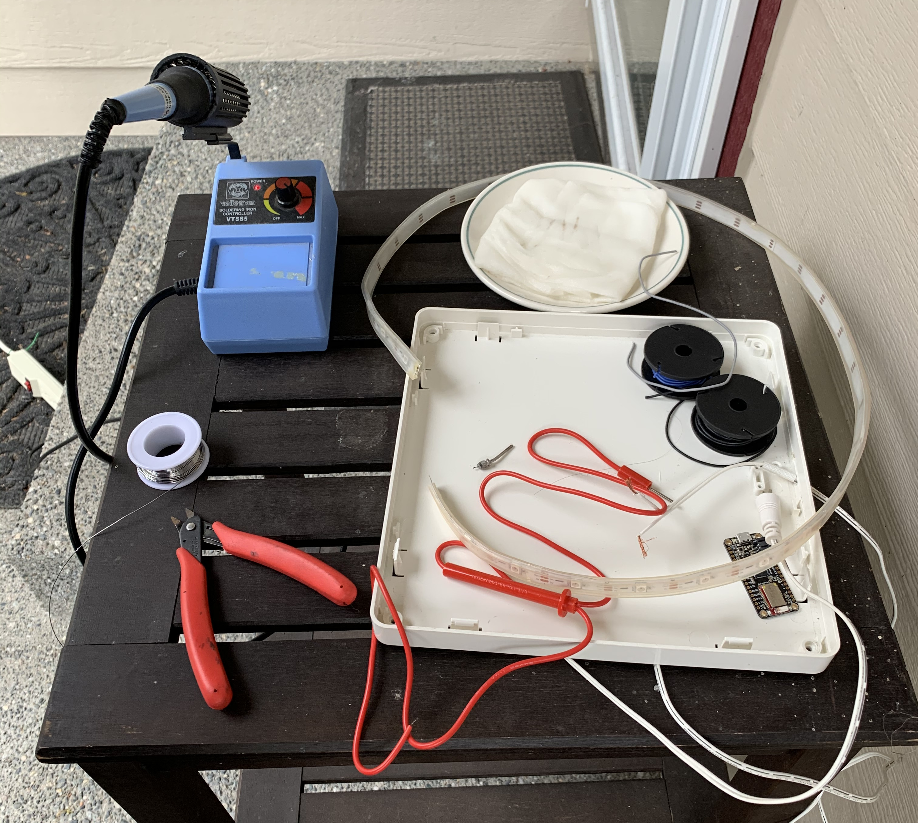 Paul migrated his user-input and animation-drawing Arduino timing code from his Illuminated DJ Table project, and created animations for the 25 Neopixel RGB LEDs.
