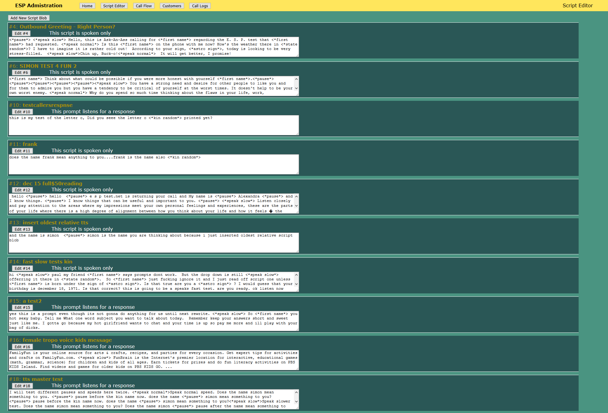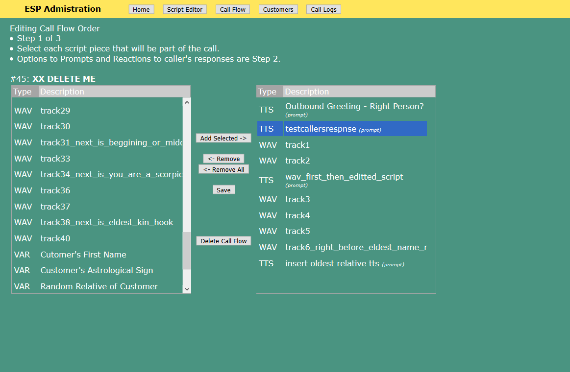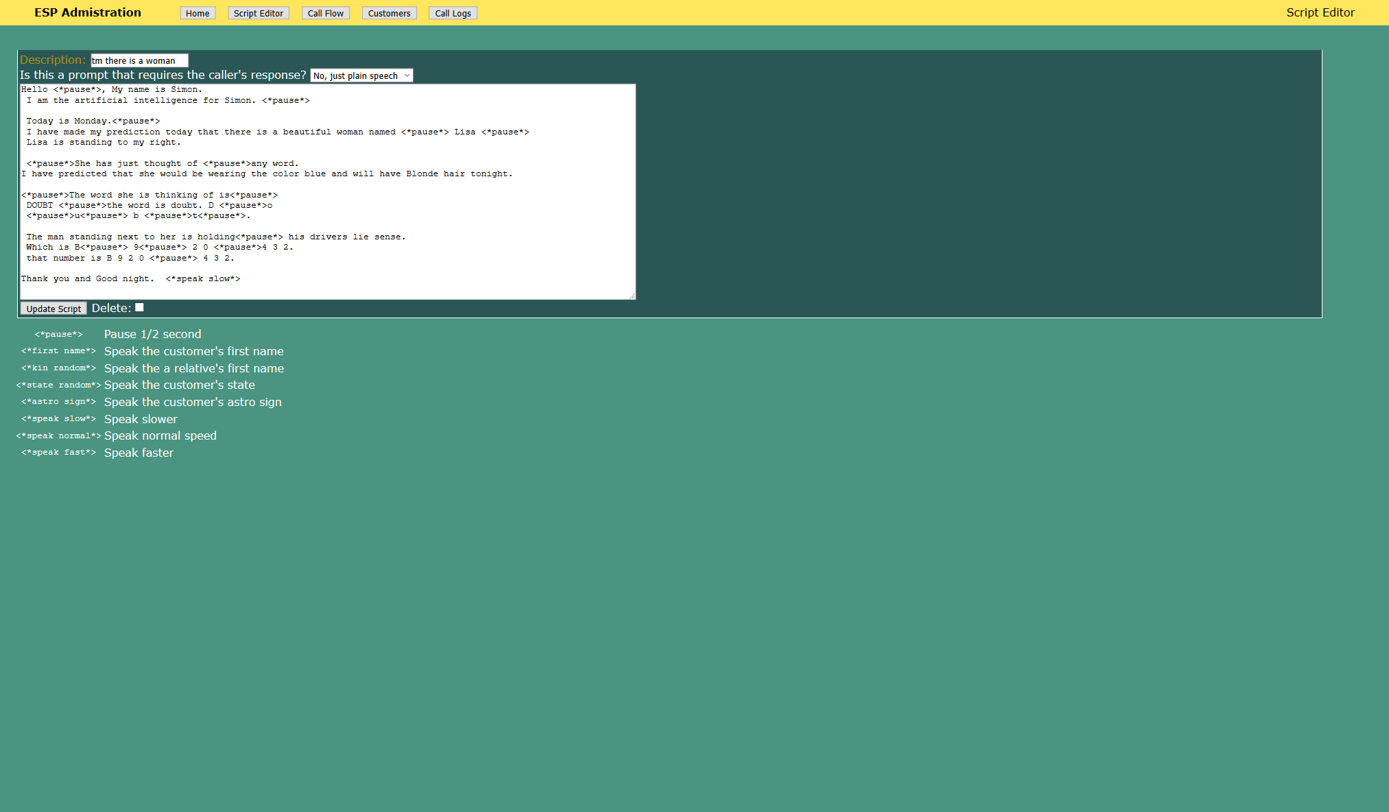 The service's owner is able to create call flows by writing script snippets, integrating the customer's personal information as variables. Outbound calls can be initiated, inbound calls are accepted, with full logging and billing information updated to the administrator's web interface.